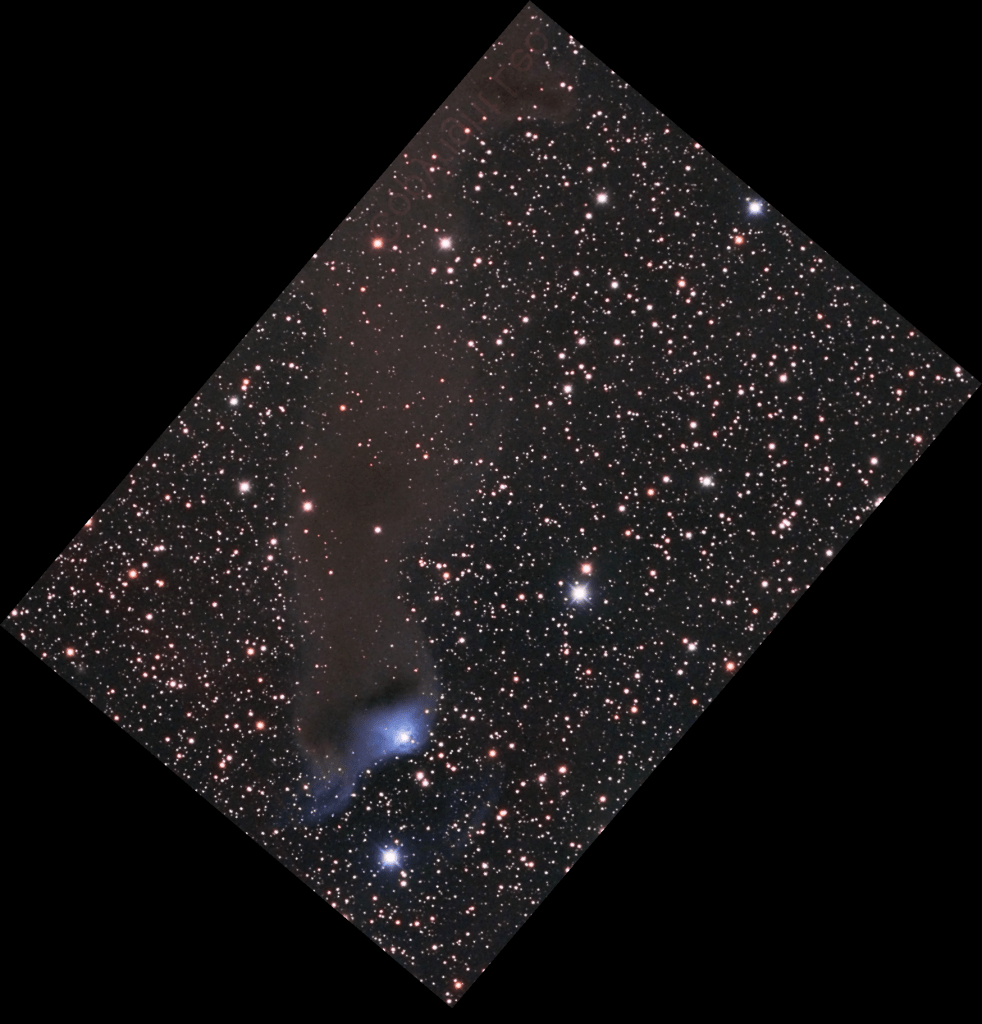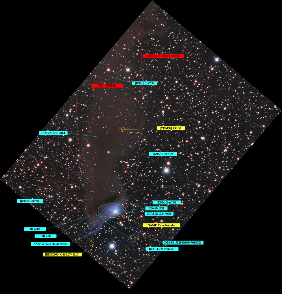 Lo cierto es que en la descripción de Barnard se habla de que la estrella BD+69 1231 está ‘en la parte superior’ (¿veía él que la sombra se prolongaba por el sur?) y las coordinadas que registra aún se hallan más al suroeste de la estrella [α 22 11 δ +69 19]. Claro que ese ‘desfase’ podría ser debido al uso de las de la época B1875 que eran las habituales en aquel momento. No he podido comprobar si hay coincidencia pero se queda pendiente.