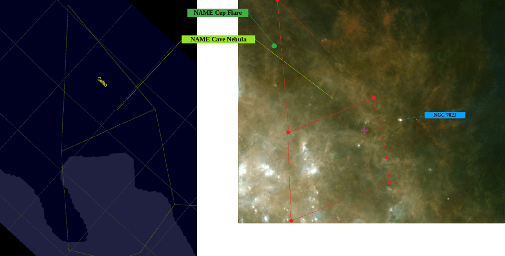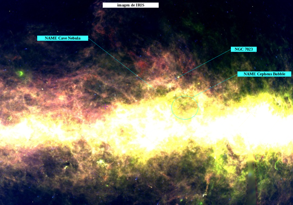 En la derecha se aprovecha la imagen de AKARI en la entrada anterior para ver la referencia de la nebulosa Iris. En ella se señala con un punto verde el lugar que señalan las coordenadas de la Llamarada de Cepheus a la que se aludirá más adelante.