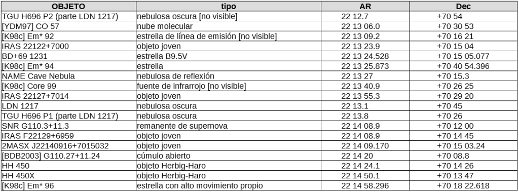 La más difundida entre la afición ‘Cave Nebula’ se corresponde con el nombre SH2-155 o, según el catálogo de Beverly T. Lynds, con el de nebulosa brillante LBN 529. Este objeto fue recogido posteriormente a 1908 en estos dos catálogos.