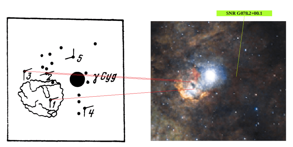 Un ejemplo de este posible intercambio de denominaciones es el artículo donde se realiza un análisis de la nebulosa que se distingue junto a Sadr realizado por las astrónomas rusas Vera Petrovna Arkhipova y Tatjana A. Lozinskaia (1978) donde se distinguen varias estrellas cercanas. Además la nebulosa estaría interaccionando con la expansión del remanente de supernova SNR G078.2+00.1.