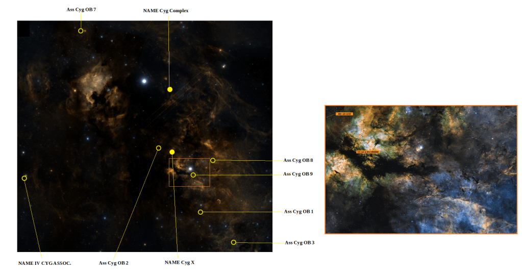 La región del espacio en que se sitúan todas estas asociaciones recibe la denominación principal de NAME Cyg Complex donde cabe destacar a NAME Cyg X, uno de sus principales focos de actividad. A la derecha dos estrellas pertenecientes a Ass Cyg OB 2 que recoge nuestra astrofotografía.