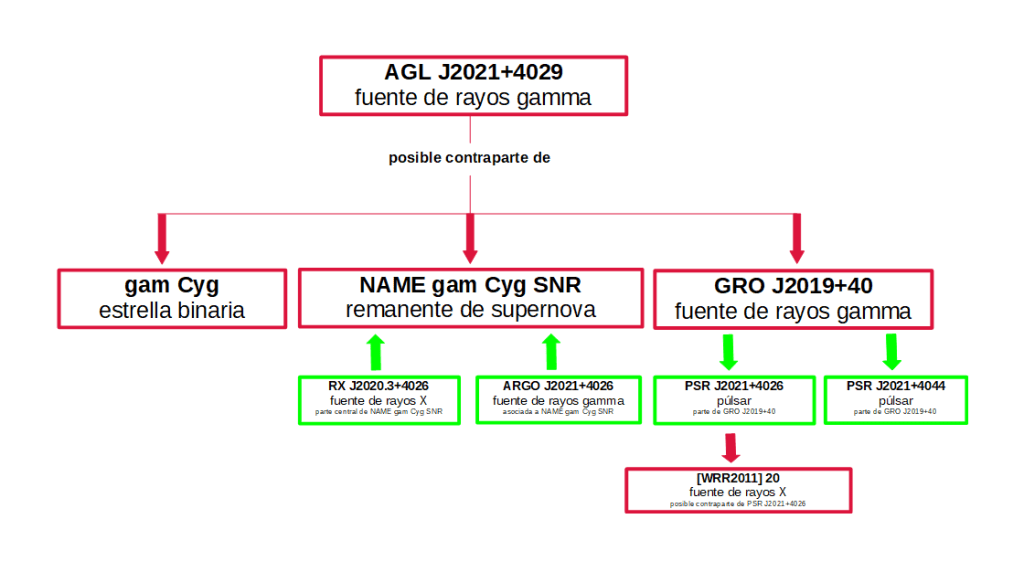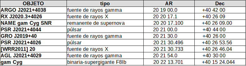 De gam Cyg, a pesar de dar nombre a muchos de los objetos de esta región, poco más se puede decir por las fuentes que he podido consultar. Parece que las otras dos están en una disposición más asequible y allí sí se han detectado otras fuentes con coordenadas coincidentes o muy próximas con la excepción de ARGO J2021+4026 que es otra fuente de rayos gamma que está asociada con el remanente de supernova gam Cyg.