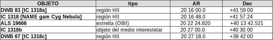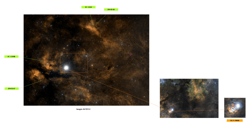 A pesar de todo este lío de nubosidades, lo reflejado en las dBs del CDS es que ALS 19666, como se señalaba antes, está directamente relacionada con IC 1318, la denominada nebulosa gam Cyg.