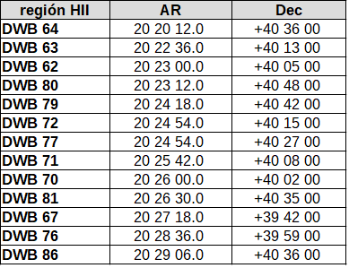 Aunque se mantiene IC 1318b, las partes a y c han cambiado su nomenclatura y han tomado el identificador DWB. El resto de regiones HII serían éstas :