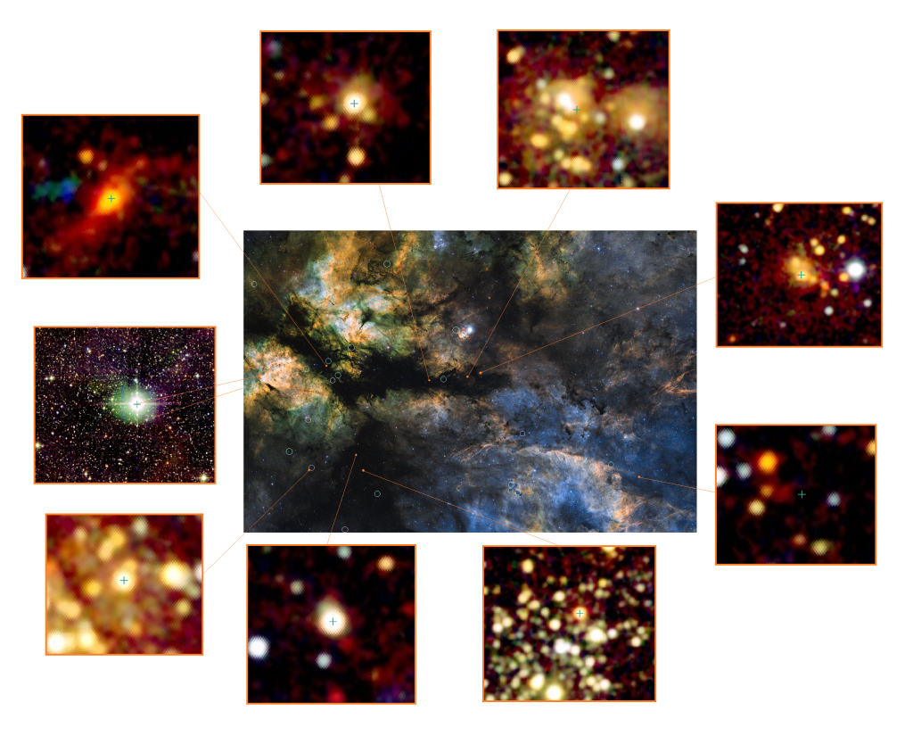 Aquí están señaladas las regiones HII, las fuentes de infrarrojo y los objetos jóvenes (junto con unas pocas estrellas) extraídas principalmente de las tres fuentes indicadas en el pie de foto (seguro que van apareciendo más).