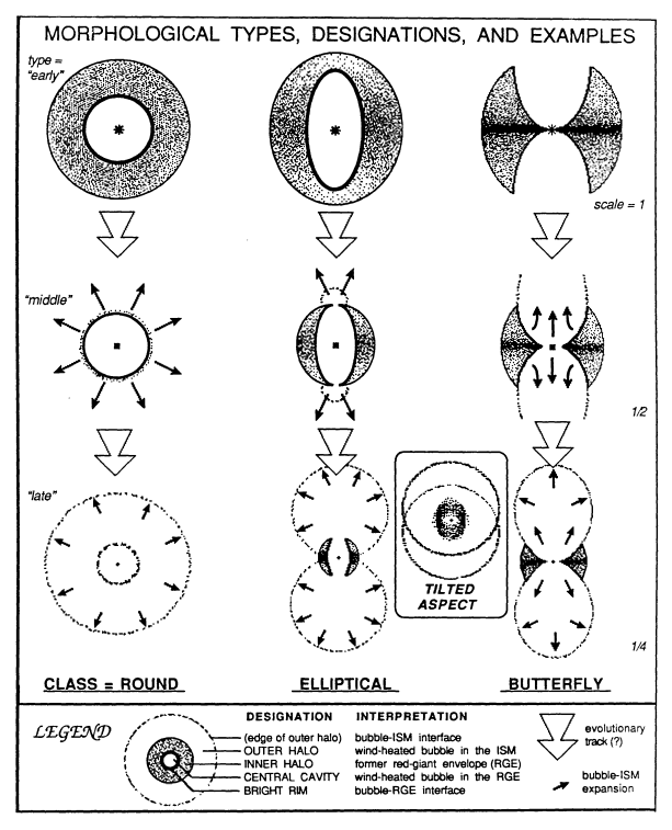 Ya vimos varios ejemplos de su etapa protoplanetaria (post-AGB). Y ya nos hicimos una idea de las numerosas formas que podían presentar, se podría decir que una para cada estrella. Pero lo terrícola es agrupar y clasificar para entender, así que, en cuanto los instrumentos ópticos lo permitieron, aparecieron los estudios morfológicos.