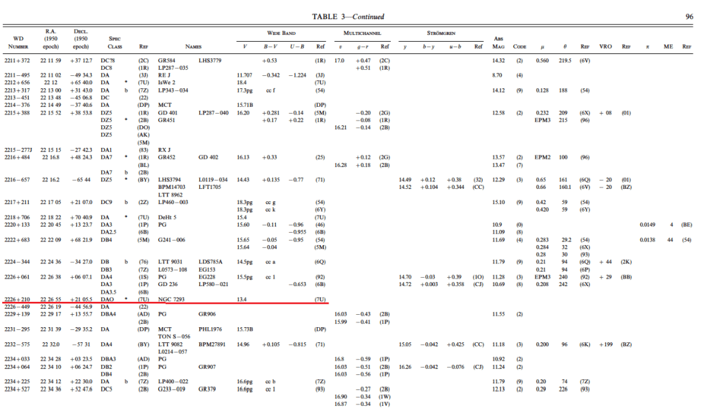 En las dBs del CDS los objetos ‘nebulosa planetaria’ no están diferenciados de sus enanas blancas (al menos en las que he comprobado), se les otorga, eso sí, clasificación espectral. En el caso de NGC 7293, la enana blanca responsable es WD 2226-210, de tipo DAO.5.
