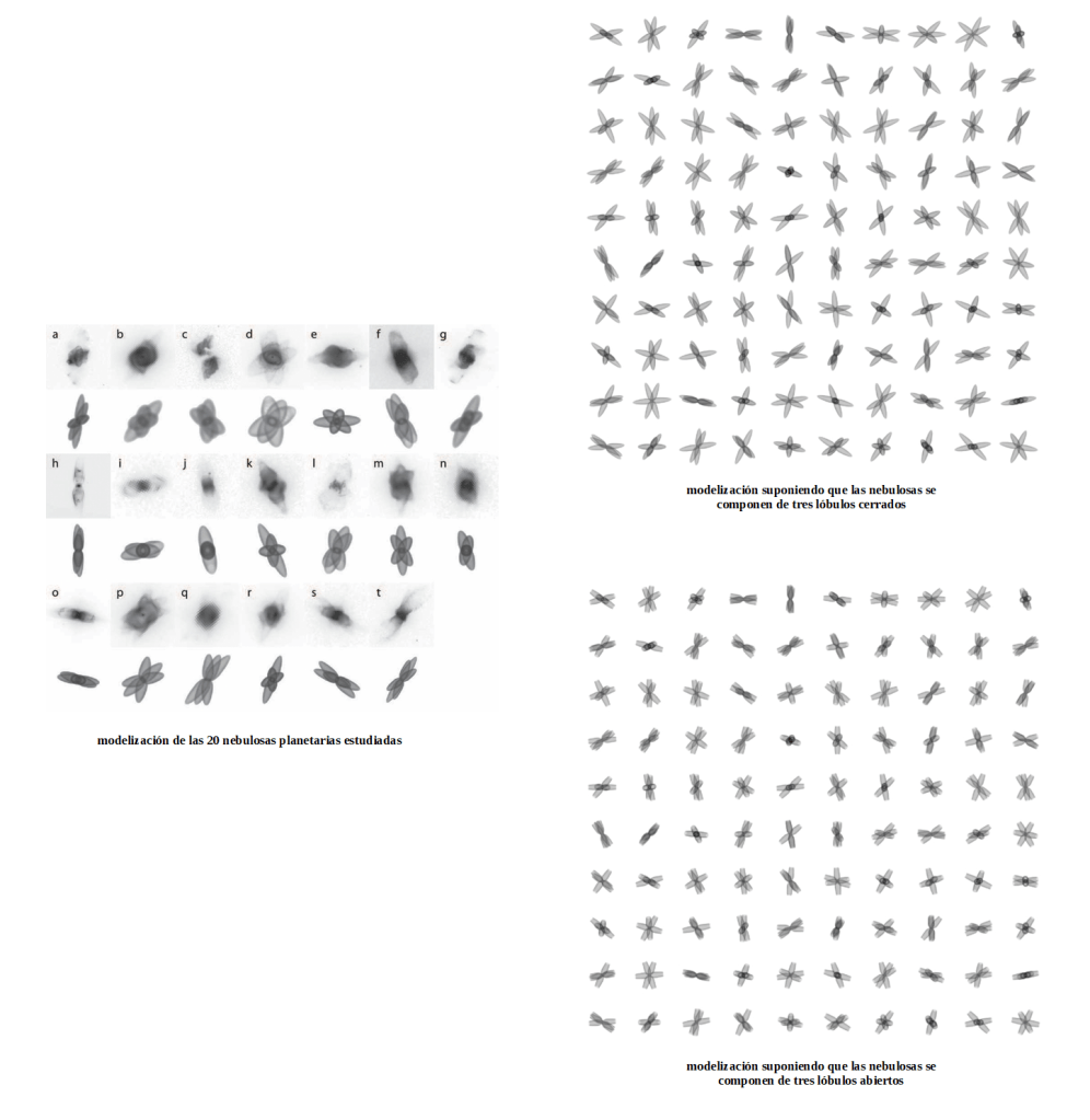 Con datos de 20 nebulosas, un equipo investigador japonés se planteaba en 2012 si se podía pensar en un desarrollo similar para todas las nebulosas planetarias. Partían de la premisa de que se trataba de objetos multipolares cuyos lóbulos podían estar producidos por la estrella moribunda en rotación que dispersaba sus haces a través del toroide central (hay que recordar que este toroide ya estaba presente en las estrellas post-AGB). Considerando que las nebulosas tuvieran tres lóbulos, se podría explicar la mayoría de las características que se han encontrado en ellas de forma independiente. Estas serían las morfologías resultantes (Chong et al., 2012):