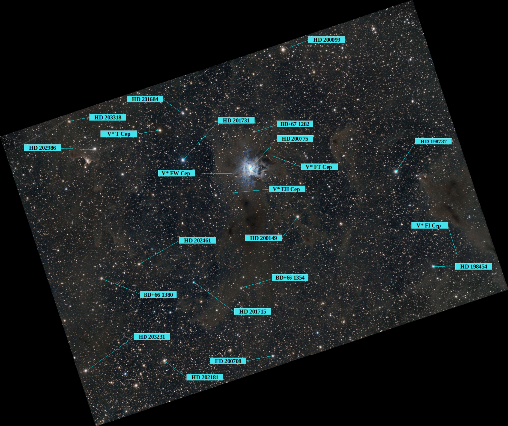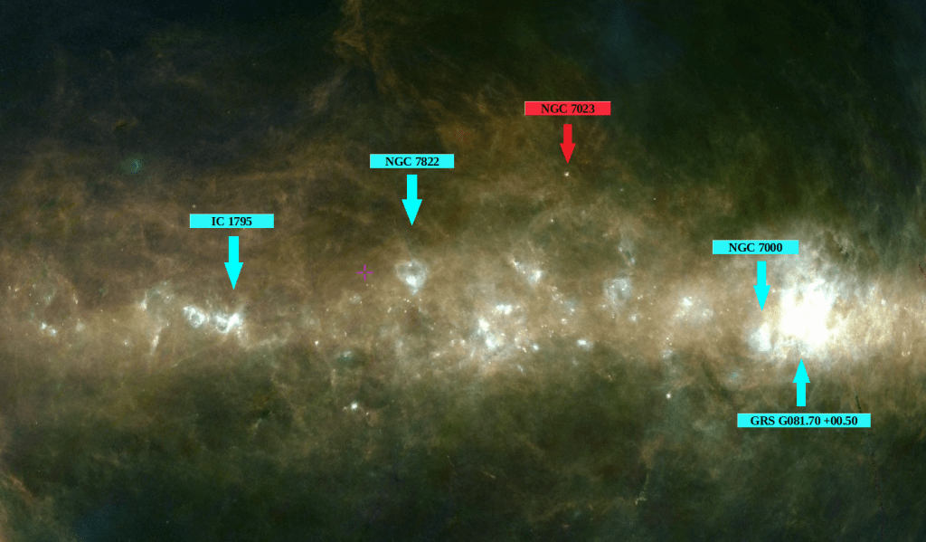 Algunos de los objetos señalados ya se han visto: IC 1795, Nebulosa Cabeza de Pez (ver El pez dorado) y NGC 7000, North America Nebula (ver El corazón de las tinieblas). En rojo la Nebulosa Iris.