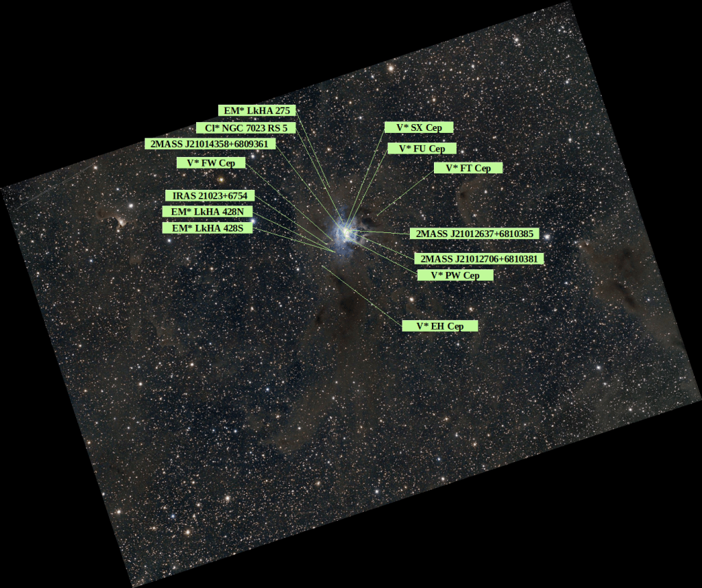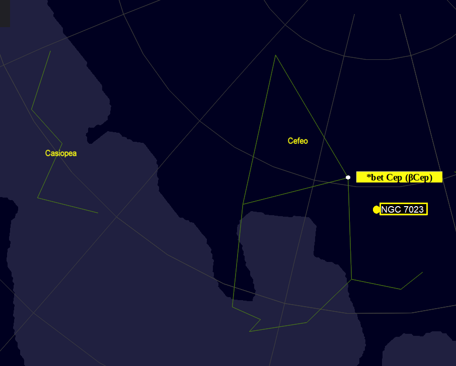 Dada su proximidad, en alguna de las primeras fuentes aparece NGC 7023 como perteneciente a la constelación Draco (Pease, 1920) pero no quedan muchas dudas respecto a su vinculación a Cepheus