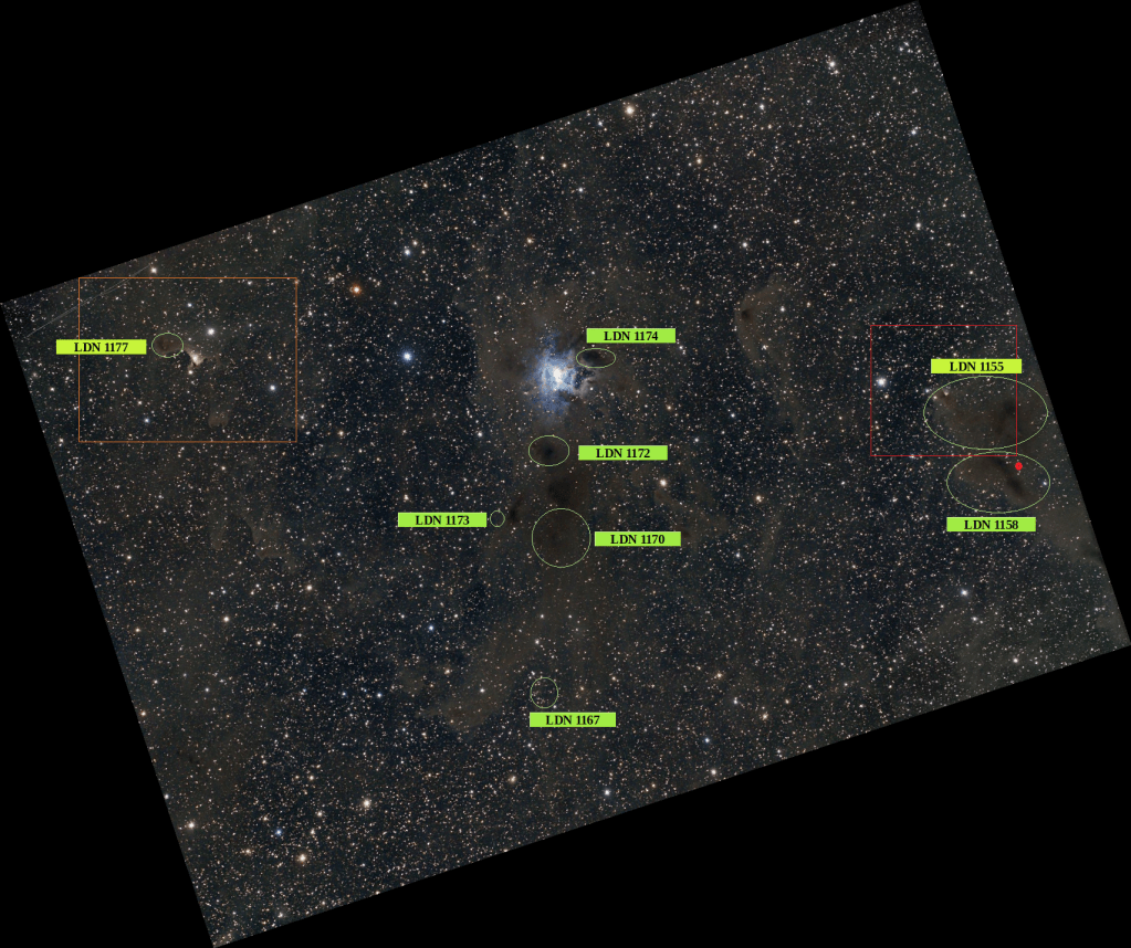 Un vistazo al resto de estas nubes oscuras nos habla de su alta opacidad (recordemos el Catálogo de Berverly T. Lynds). De menor a mayor LDN 1167 (2), LDN 1170 (3), sigue LDN 1158 (4) la misma que LDN 1177 que hemos comentado y que LDN 1174, al lado de Iris.