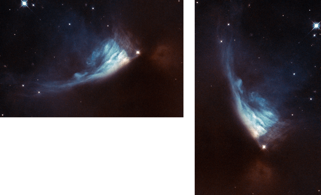 LDN 1155, diagonalmente opuesta en la fotografía a SH2-136, el fantasma, está claramente realzada por la presencia de la variable de tipo Orion, V* PV Cep, que también produce con su brillo una nebulosa de reflexión, NAME Gyulbudaghian’s Nebula (GM 1-29). Aquí su imagen en detalle tomada por el Hubble
