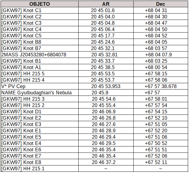 Parece que este rincón del cielo es armenio ya que la mayoría de los objetos descubiertos lo han sido en el Byurakan Astrophysical Observatory (BAO) debido, en parte, al trabajo realizado por el astrónomo Armen Liparit Gyulbudaghian, también armenio, que da nombre a la nebulosa brillante y que, preocupado por explicar el proceso de nacimiento de las estrellas, ha centrado su atención en los objetos Herbig-Haro de la zona ( Gyulbudaghian, 1984). Ocurre que los objetos Herbig-Haro son unos buenos trazadores de las regiones en las que se forman estrellas y todo parece indicar que por detrás de esos nubarrones hay todo un mundo en ebullición.