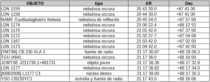 Lo mismo que ocurría con LDN 1173, la localización en la fotografía de esta nebulosa oscura necesita explicación porque nos encontramos con mapas en los que puede dar la sensación de estar incluida en LDN 1158. Con los datos de opacidad que hemos visto y la inclusión de la nebulosa de Gyulbudaghian como parte integrante de ella, me parecía más intuitivo señalarla desplazando su centro (punto rojo en la astrofotografía). No obstante esto sólo debe ser indicativo del cuidado que hay que tener con tomar estas representaciones al pie de la letra. Plasmar en un plano algo tridimensional siempre es difícil. Si ese algo es polvo y gas que no se sabe si dispuesto hacia la parte trasera o hacia delante, todavía se complica más.