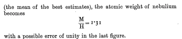 Ya lo explicaba Christian Thomas Elvey en 1928 analizando los datos recogidos de la explosión de la Nova Aquila en 1918: no cabe un elemento más ligero (se entiende que el hidrógeno) por mucho que el espectro del gas nebular así parezca indicarlo. Y, si no es un nuevo elemento, debe tratarse de una variación en las condiciones de uno ya conocido.