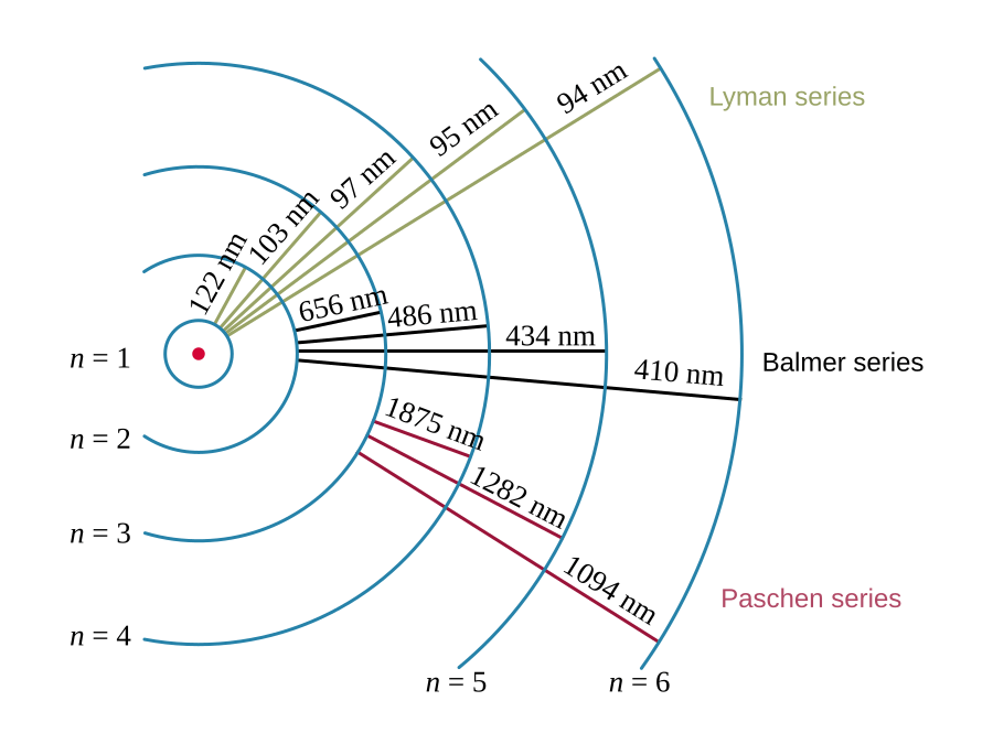 ¿Acaso no habrá otras series en otras longitudes de onda? Se había estado preguntando Johannes Robert Rydberg y diseñó, sobre la de Balmer, una fórmula más general. Y ahí se puso Theodore Lyman a descubrir su propia serie en el ultravioleta o Friedrich Paschen en el infrarrojo … hubo más, pero yo me quedo aquí con este esquema que explica los saltos de nivel que se corresponden con cada serie de las citadas (Lyman cons altos hasta el nivel 1, Balmer hasta el 2 y Paschen hasta el 3).