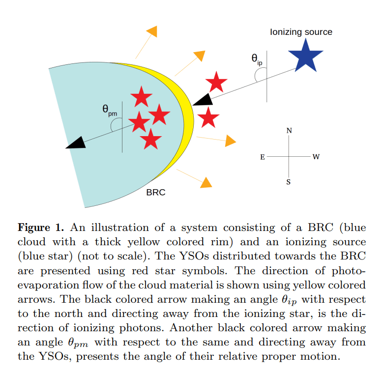 Es decir, dentro de la nube irradiada se están produciendo distintas generaciones de estrellas que también parecen estar guardando relación con el ángulo de incidencia de los rayos ultravioleta. Este ángulo haría que esos brotes estelares se desplazaran en la misma dirección, en sentido contrario, con un mismo movimiento propio. Se estaría hablando de una asociación (o cúmulo) estelar (Saha et al., 2022).