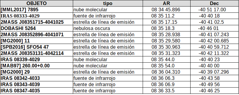 Me había quedado en la entrada anterior en el entorno inmediato a 2MASS J08353144-4040190 que ioniza la nebulosa NGC 2626 (la telaraña de la tarántula que imaginaba entonces). Parecía estar rodeada de un grupo de objetos que Van den Bergh habría descrito como asociación R aunque no todas las identificadas son, al menos en las dBs del CDS, como nebulosas de reflexión.