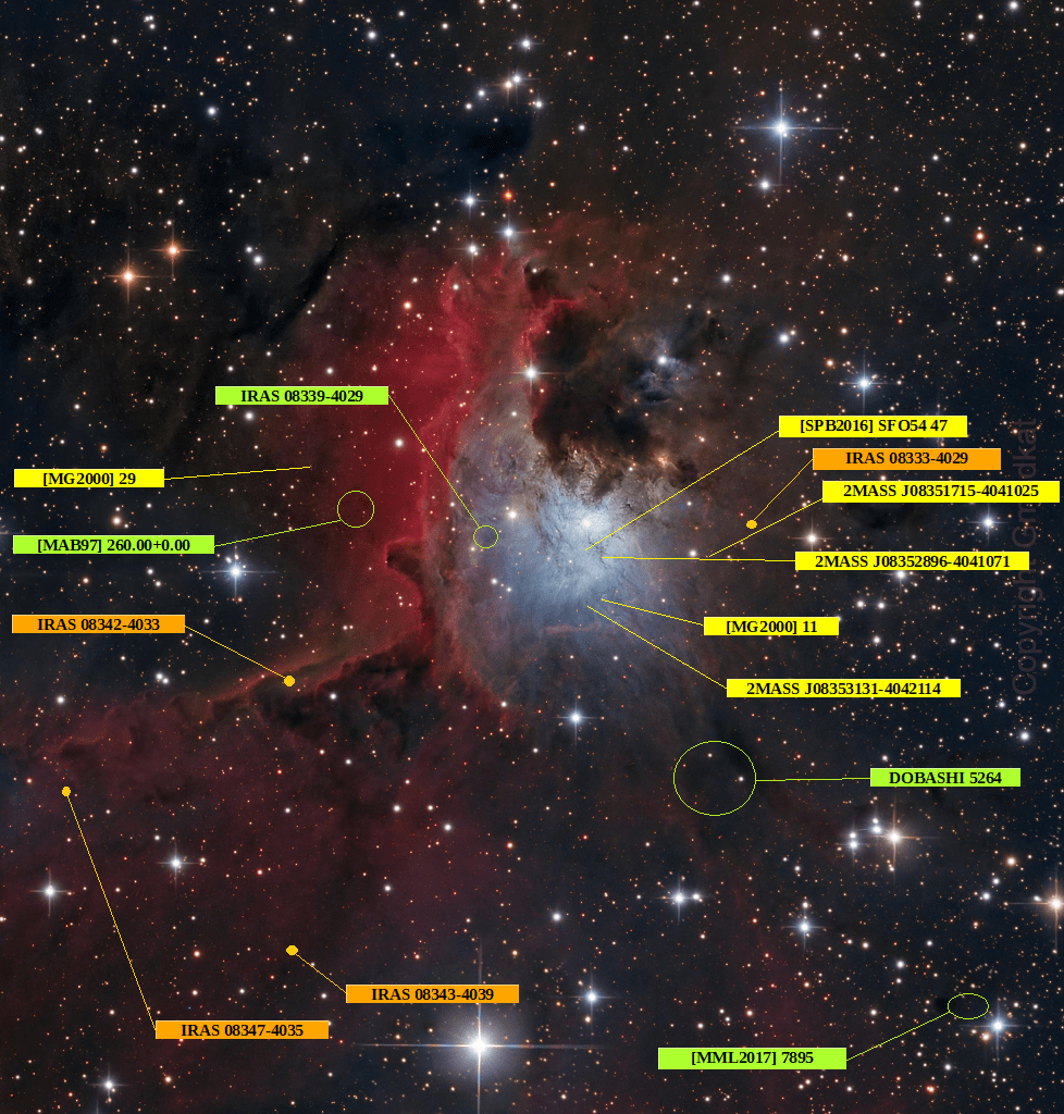 En la siguiente imagen se han señalado fuentes (estrellas) de emisión que vienen a ser un aviso de la presencia de objetos de los que todavía no se pueden apreciar todas sus características. Podría tratarse de estrellas Be o Wolf Rayet, también de objetos Herbig-Haro o estrellas con envoltura; todas ellas muestran líneas de emisión y se ocultan tras distintas densidades y composiciones gaseosas como las nubes moleculares o las menos específicas nebulosas oscuras. También señaladas.