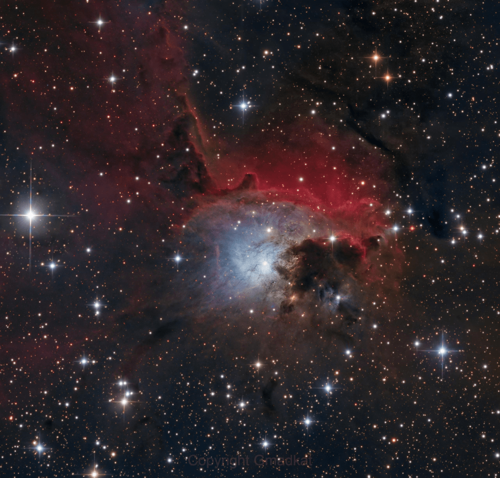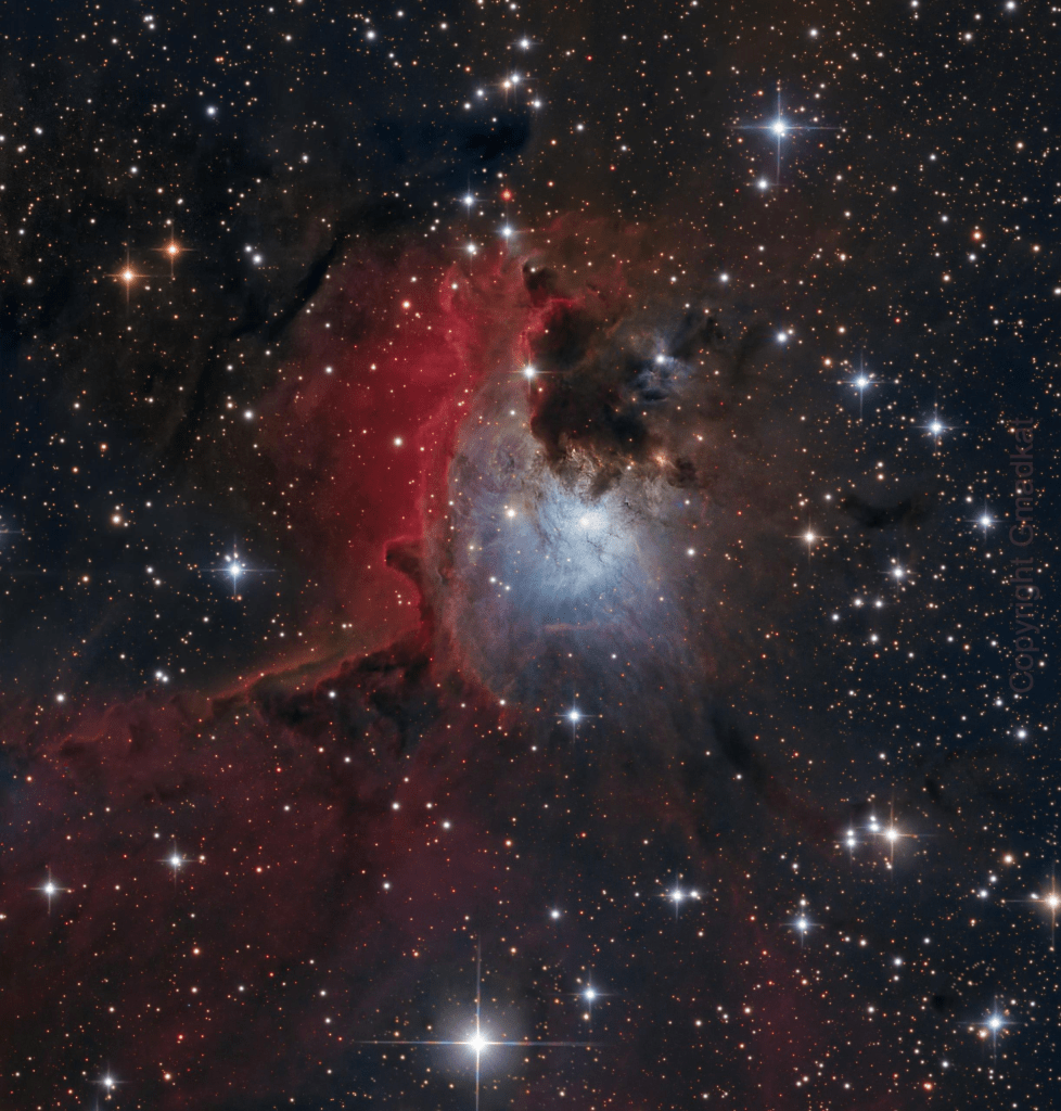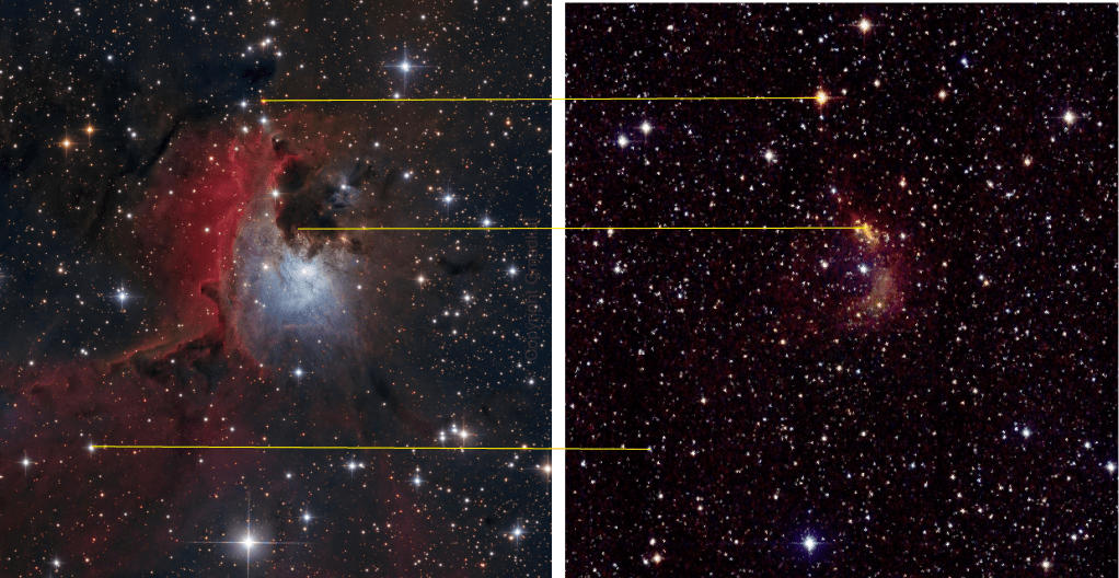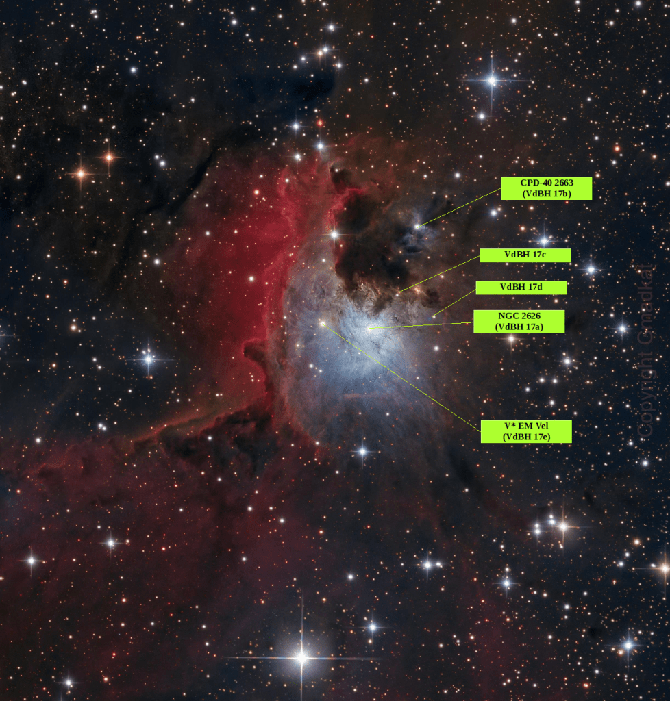 Se trata de la nebulosa de reflexión NGC 2626 en cuyo centro se localiza una fuente de infrarrojo, IRAS X0833-405. (me) Resulta curioso que sólo tenga una referencia bibliográfica en la dB Simbad y que ésta hable de L1616 en Orion.