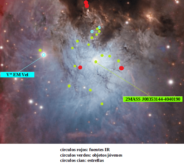 En medio de tanto brote juvenil brilla en infrarrojo medio IRAS 08337-4028, que parece estar compuesto por uno de esos candidatos jóvenes, 2MASS J08353101-4038221, y una fuente de infrarrojo cercano, 2MASS J08353094-4038266.