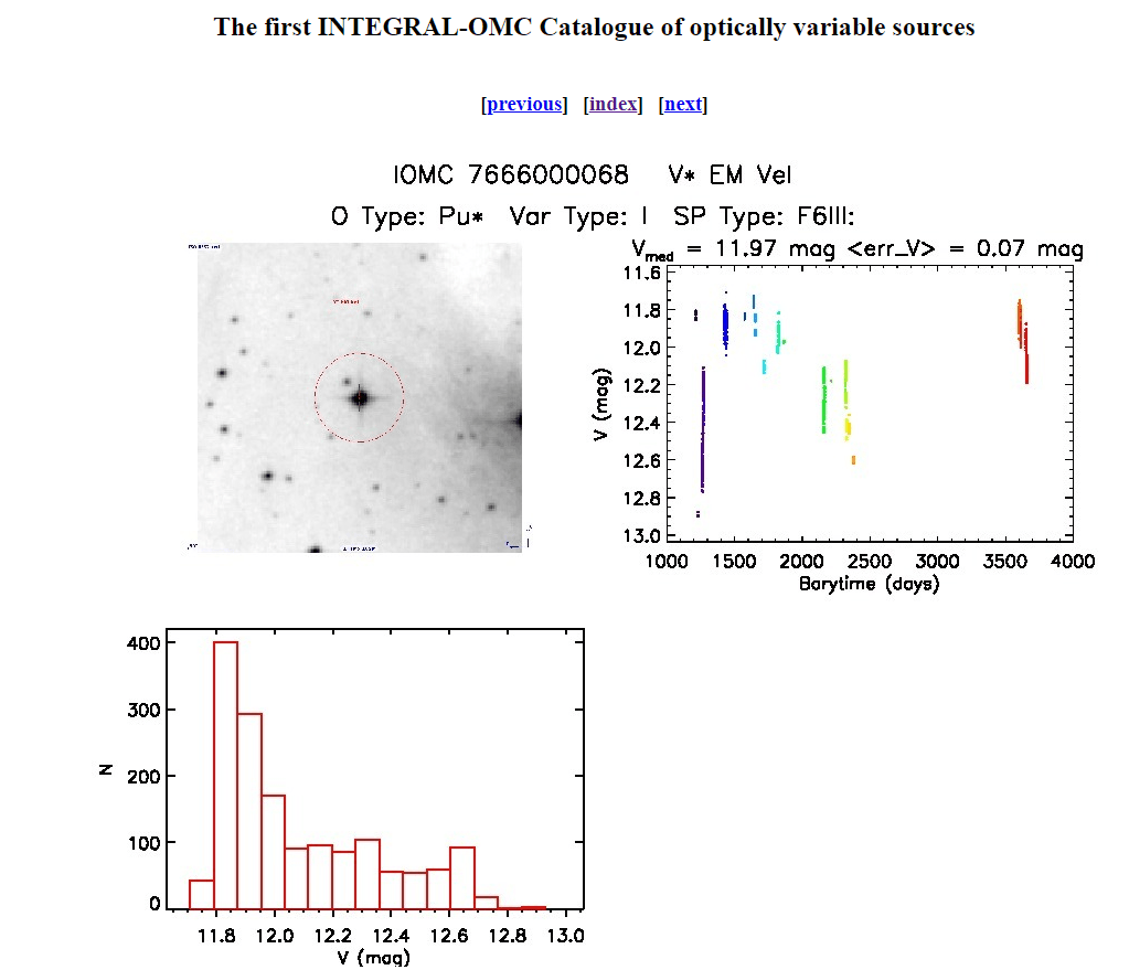 A una distancia de 926.269 pc ±9.2661 (2020) está la variable pulsante V* EM Vel (tipo F6III). No hay bibliografía específica sobre la estrella pero se pueden obtener datos sobre su variabilidad en otro de los catálogos autóctonos. Esta vez se trata del The first INTEGRAL-OMC Catalogue of optically variable sources, que contiene datos obtenidos por la OMC-Optical Monitoring Camera del observatorio espacial de la ESA, INTEGRAL. El archivo es parte del proyecto SVO–Spanish Virtual Observatory (Alfonso-Garzón et al., 2012)