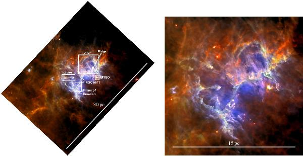 Quizás, lo más novedoso respecto a los estudios precedentes sea la identificación de una estructura de filamentos que coinciden con los lugares de formación estelar y donde, en uno de ellos, se encuentran ubicados los famosos pilares (Hill et al., 2012).