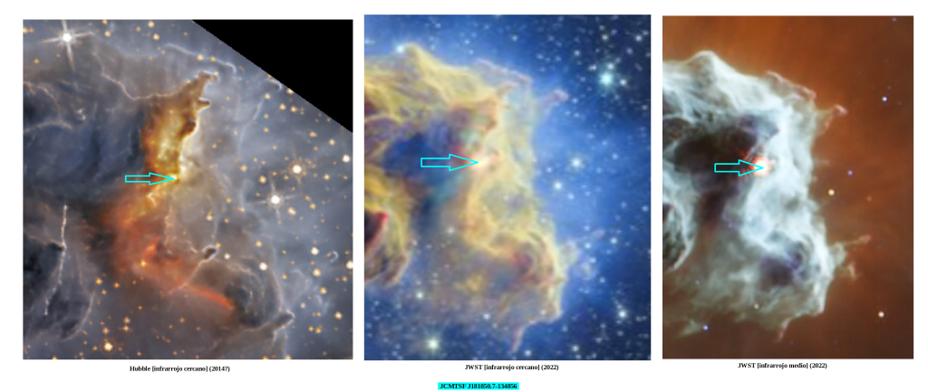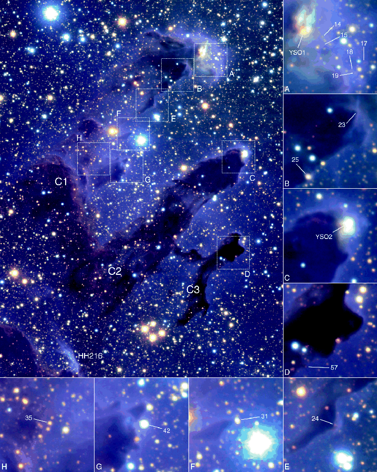 Las siguientes imágenes muestran un esquema del proceso de evaporación de los glóbulos y la identificación en los ‘pilares’ registrados por el Hubble en 1995 (aunque no de todos se pudo obtener evidencia). Proceden ambas del mencionado estudio.