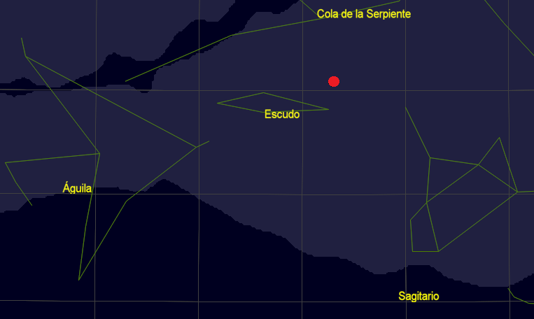 La estrella naranja marca la posición de HD 168137, la binaria espectroscópica que, en los estudios del grupo encabezado por Flagey, se señalaba como la estrella de tipo O más cercana a los pilares de las que se consideran responsables de su morfología.