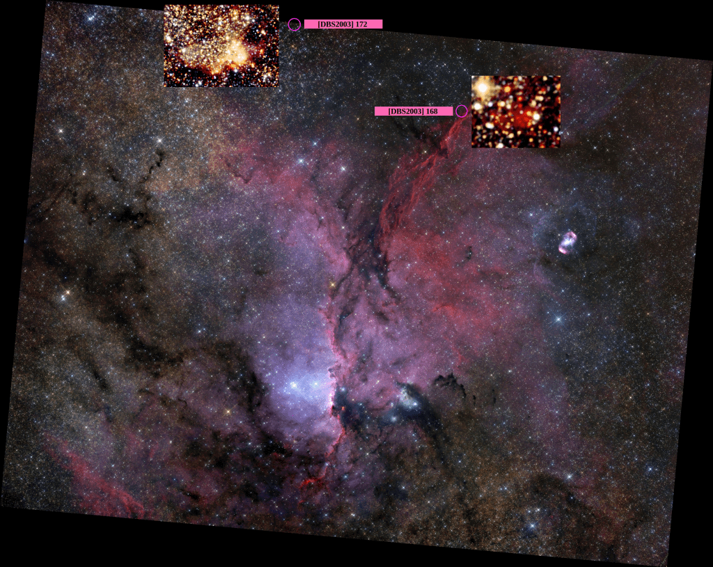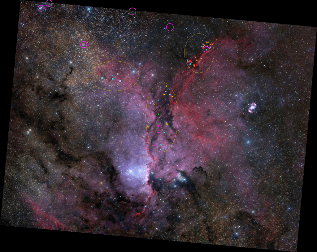 Llama la atención la concentración de distintos objetos por zonas: los objetos jóvenes (o candidatos) y núcleos densos se agrupan en el círculo amarillo de la parte superior derecha. Se trata de una región HII con distintas nebulosas oscuras que parecen muy activas en cuanto a formación estelar se refiere.