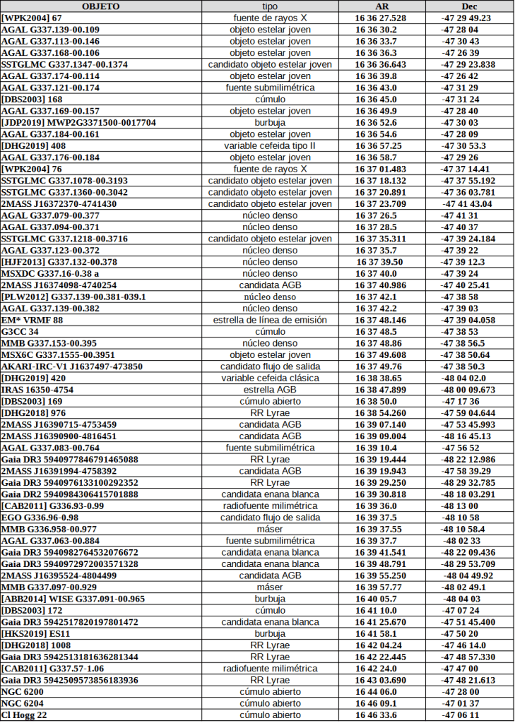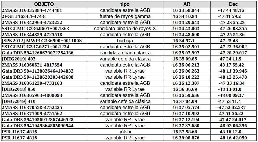 El círculo amarillo de la parte izquierda es el que menos diversidad de objetos presenta: varias variables RR Lyrae y una fuente submilimétrica. El círculo central, por el contrario, presenta más disparidad.