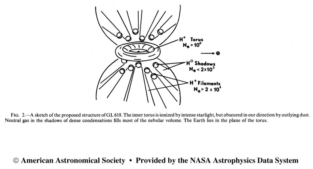 El modelo más repetido se compone de dos lóbulos polares con un toroide (circundante) de polvo central calentado por la estrella (Schmidt y Cohen, 1981).