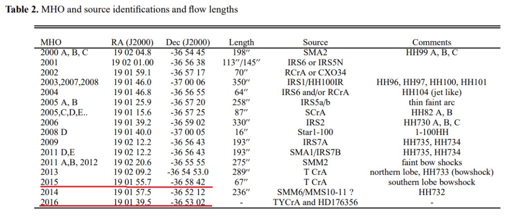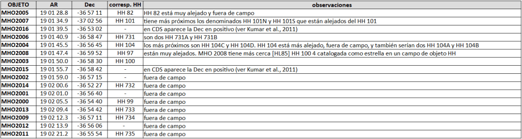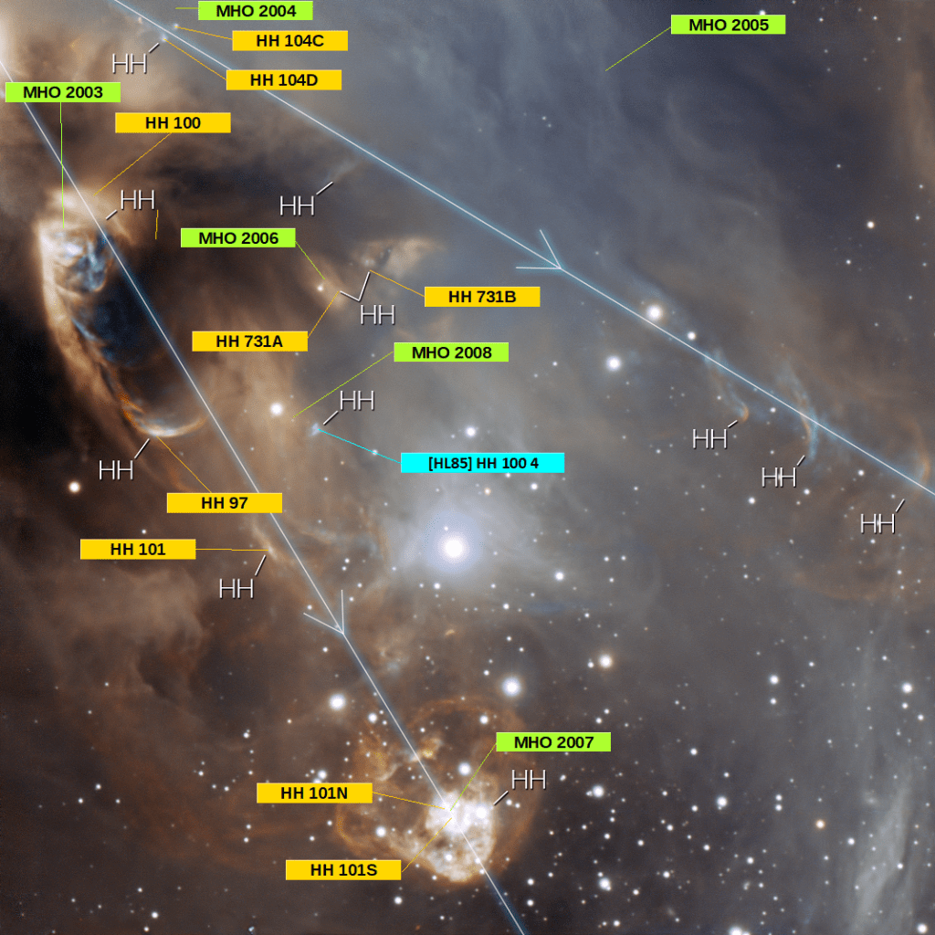 Estos (para mí) nuevos objetos, los denominados MHO están descritos como objetos de emisión. Recogidos en el catálogo de MHOs (Davis et al., 2010) se refieren a emisiones de hidrógeno molecular registrados en los flujos emitidos por estrellas jóvenes. El conjunto de objetos Herbig-Haro que se podía ver reflejado en la imagen utilizada en aquella ocasión tiene una correspondencia con este nuevo tipo de objetos.