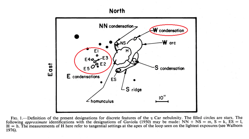 Y es que la propia estrella ha dado pistas sobre otras erupciones. Una datación posible podría ser el siglo XV. Al menos eso es lo que se puede interpretar de algunas condensaciones de gases a su alrededor estudiadas en 1978 (Walborn, Blanco y Tackeray). En concreto parece que las localizadas en el eje Este-Oeste (señaladas en el esquema sacado del mismo artículo).