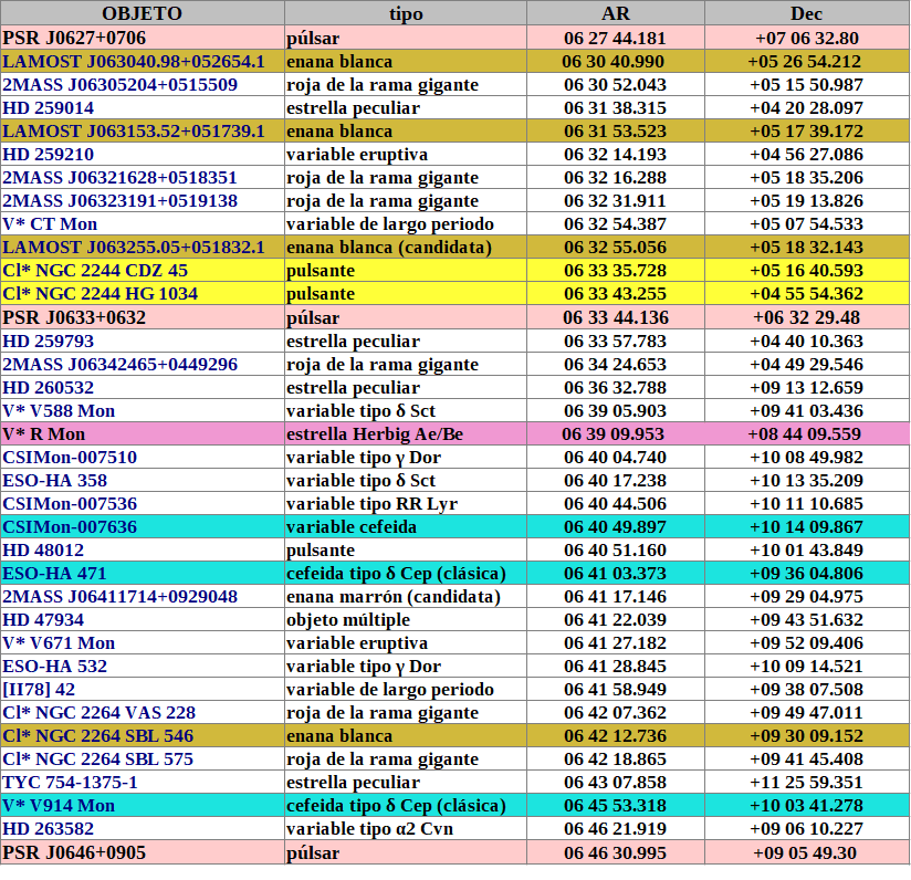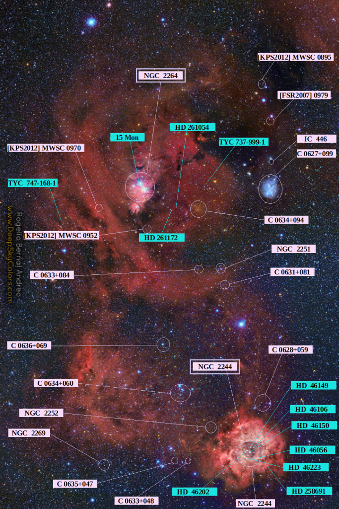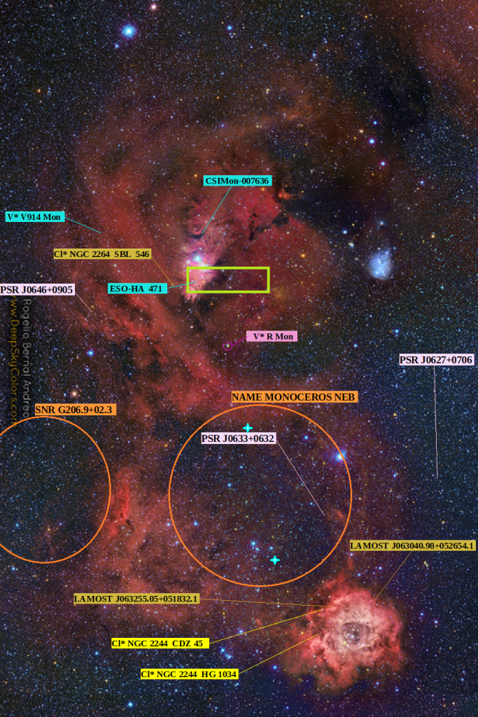 No vamos a detenernos en cada uno de estos fascinantes objetos pero hay que mencionar, aunque sea de pasada, el que aparece en la fotografía en el cruce del bucle. Se trata de la variable tipo Orión V* R Mon, una de una población de 59 contabilizada para NGC 2264.