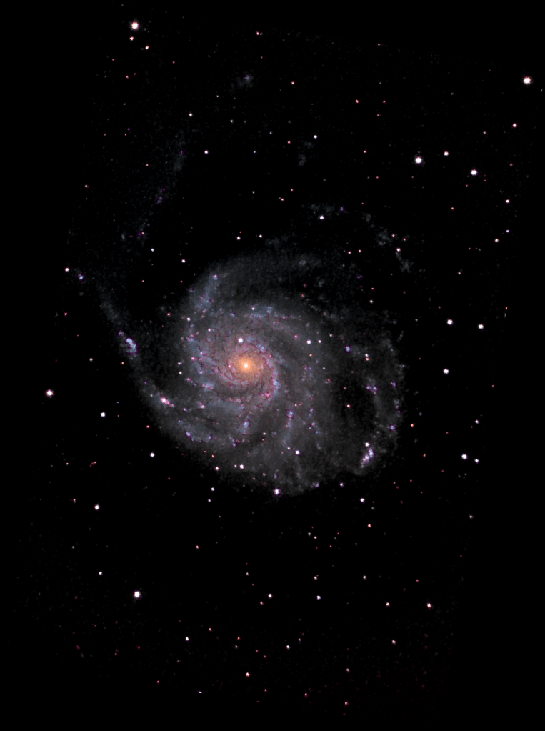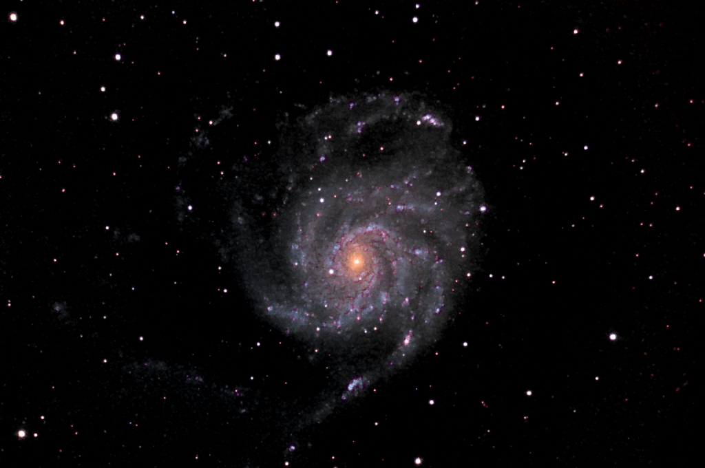 M 101 (Messier 101) se localiza formando un triángulo con las estrellas Mizar y Alkaid de la Osa Mayor. La denominada galaxia Pinwhell (del Molinete) es un 70% más grande que nuestra Vía Láctea, con un diámetro de unos 170.000 años luz frente a los 105 de nuestra galaxia. Se encuentra a una distancia de 21 millones de años luz de la Tierra (todos los datos de 2003. La última distancia tomada en 2019 es de unos 23 millones de años luz – 7,11 Mpc).