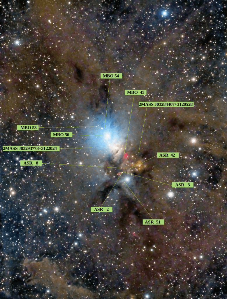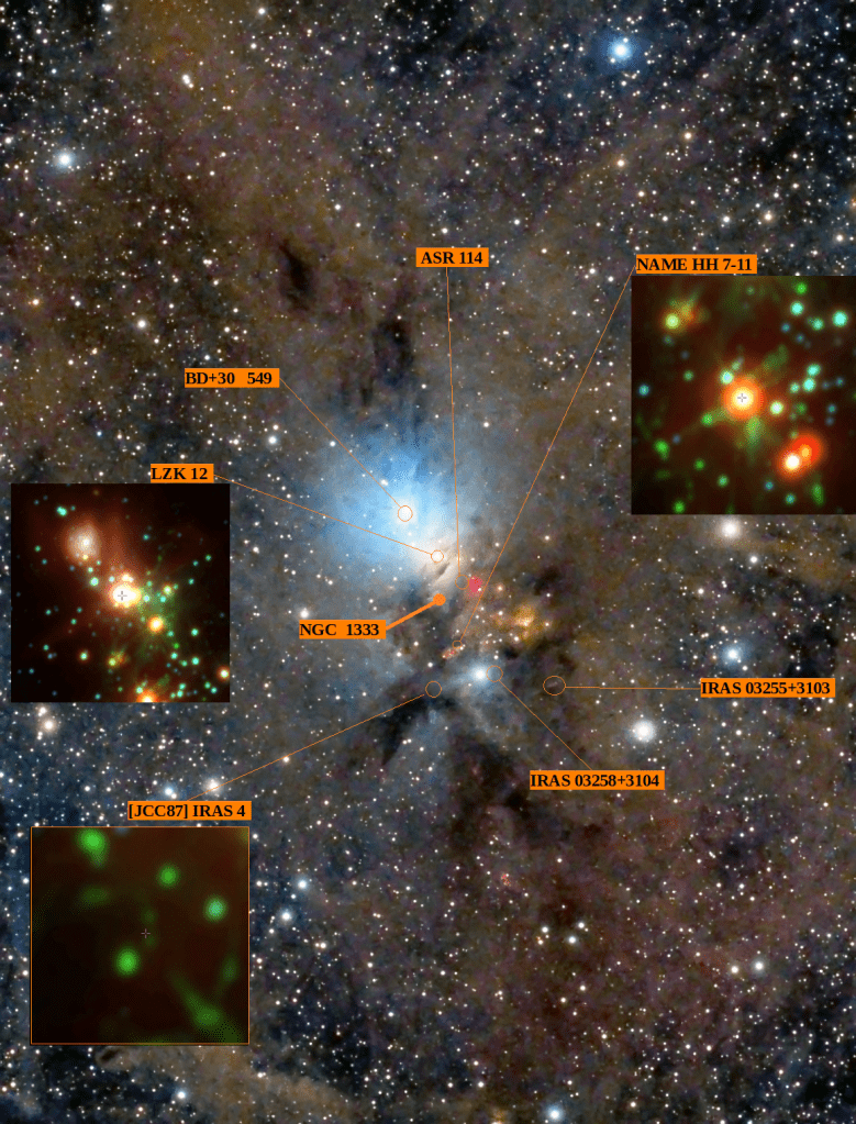 NGC 1333 es un cúmulo muy estudiado y, por tanto, con muchos objetos catalogados. Sería muy difícil señalarlos todos en la fotografía. A continuación una selección de los más particulares.