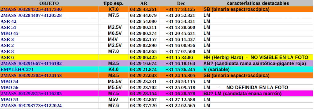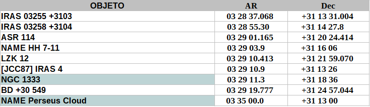 Encontramos en la tabla dos ejemplos más de lo proto-algo localizados en NGC 1333. Se trata de una candidata a formar parte de la rama asintótica gigante (RAG, AGB en inglés) y otra, a enana marrón.