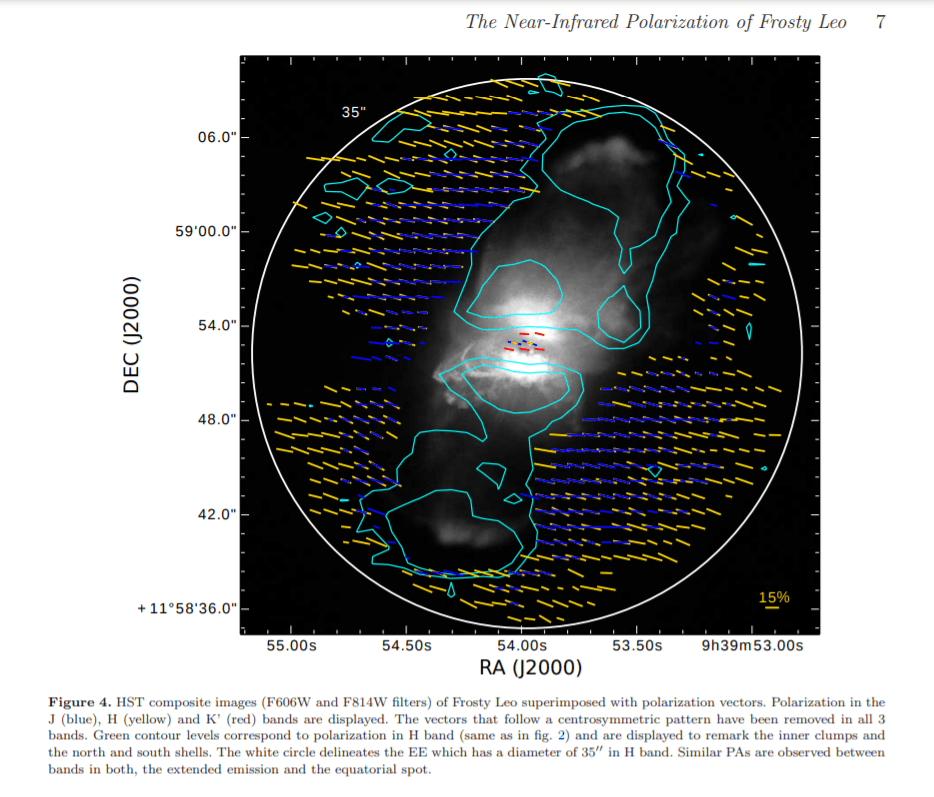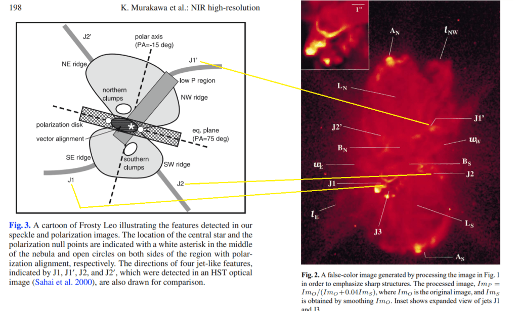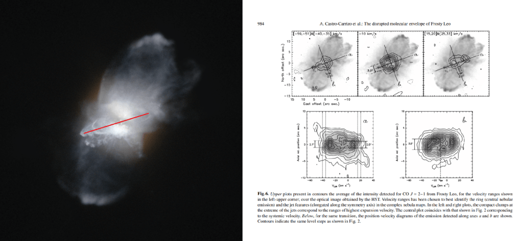 Uno de los puntos analizados que diferían de los anteriores estudios consistió en examinar los/las (?)‘ansae’, esos bordes más brillantes que parecen corresponderse con corrientes intermitentes de gas. Lo que diferencia a Frosty Leo, al menos de las dos estrellas post-AGB que hemos visto en las entradas anteriores, es que la cavidad interior por la que pasarían esas corrientes de gas, son mucho mayores debido a que el disco de polvo circunestelar, que en RAFGL 618 y HD 44179 (Red Rectangle) eran amplios y densos, aquí es muy delgado. Pero lo que hay que destacar es que, en Frosty Leo, el viento rápido que fluye hacia los polos parece que sea constante lo que no se esperaría según los modelos establecidos para una estrella K. Por otro lado, en este trabajo parecen inclinarse hacia la presencia de una binaria (Morris y Reipurth, 1990).