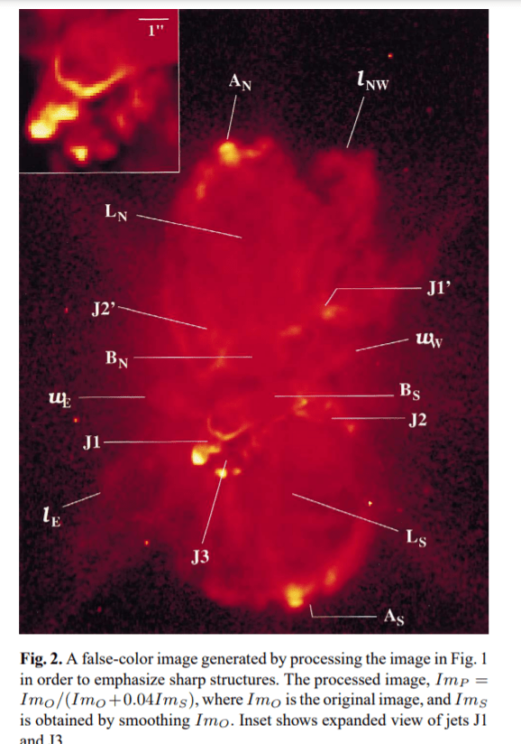 El ojo espacial del Hubble se puede acercar más y proporciona nuevos datos. A partir de sus imágenes pueden precisarse observaciones anteriores: chorros enfocados desde el plano ecuatorial, anaes como producto de un chorro polar que varió dirección e intensidad. También cosas curiosas como las se pueden ver en la imagen siguiente: ‘las manchas BN y BS parecen ser entidades distintas y densas incrustadas dentro de burbujas tenues extendidas (LN y LS) …La creación de las manchas es, por tanto, un rompecabezas, ya que cualquier mecanismo de vientos interactivos tendría dificultades para encontrar suficiente materia en el interior de las burbujas tenues para barrer las estructuras de las manchas’. También abre nuevas perspectivas a la presencia de una binaria (Sahai et al., 2000).