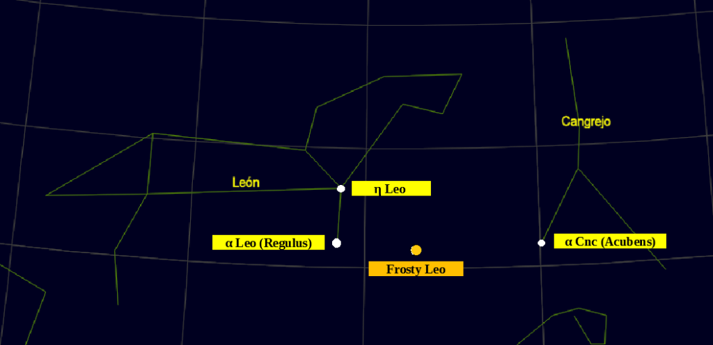Lo que llamaba la atención no era solo ese ‘inusual’ brillo de infrarrojo lejano sino su ‘poco convencional mecanismo de emisión’, pero no era una galaxia y eso se pudo comprobar con el IRAM 30m del Pico Veleta puesto que su espectro mostraba las características de los flujos ya detectados en otras estrellas evolucionadas y, además, lo que hacía ‘único’ a este objeto es la presencia de granos de hielo y su alto contenido en oxígeno (Forveille et al., 1987). Los autores del artículo acababan proponiendo el nombre de ‘Frosty Leo Nebula’ si sus conclusiones eran correctas. Y parece que lo eran porque el nombre permanece (Geballe et al., 1988).
