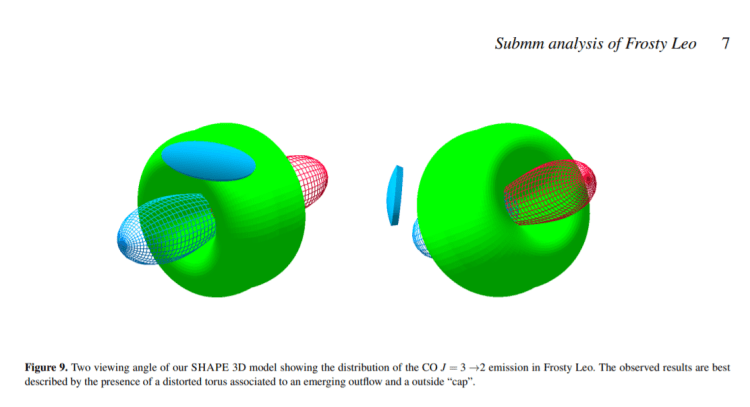 El primero de ellos construye un modelo aproximado a partir del análisis submilimétrico (infrarrojo lejano, más próximo a microondas). En él, tal como muestra la imagen, se hace presente un toroide (término que hace que Frosty Leo se parezca más a las estrellas post-AGB que hemos visto hasta ahora), un chorro bipolar y un casquete aplanado (pequeña región densa) (Sabin et al., 2019).