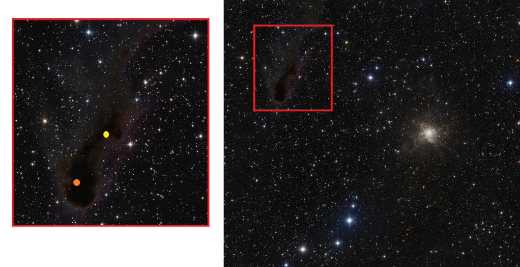 No está sola en ese fondo estrellado. Muy cerca en la imagen podemos ver uno de esos nubarrones que no pasan desapercibidos. Se trata de los glóbulos cometarios (pilares) CG 32A y CG 32B y forman parte de NAME GUM Nebula, medio interestelar (AR 07 43 00.0, Dec-42 06 00) cuyo centro se señala con el círculo de color cian en el mapa de localización visto antes.