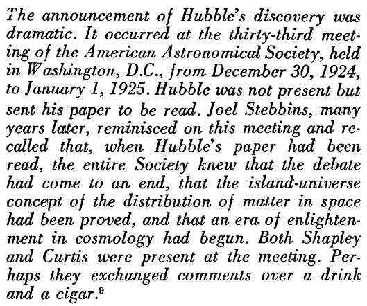 Curiosidad: se pueden encontrar tres referencias de este último artículo-clave en la bd ADS. La primera no tiene fecha; se podría pensar que es la primera en ser publicada y también que podría ser parte de la crónica (comunicaciones incluidas) de la 33ª Reunión de la AAS-American Astronomical Society celebrada en Washington los días 30 de diciembre de 1924 al 1 de enero de 1925. Está publicada en la revista Popular Astronomy. No he podido acceder a los archivos, así que no he podido comprobar si la publicación estaba o no vinculada a la AAS o si publicaba informes sobre sus reuniones. También podría tratarse de un error puesto que aparece como cabecera de página American Astronomical Society y no Popular Astronomy … misterio sin resolver … al cajón de lo pendiente.