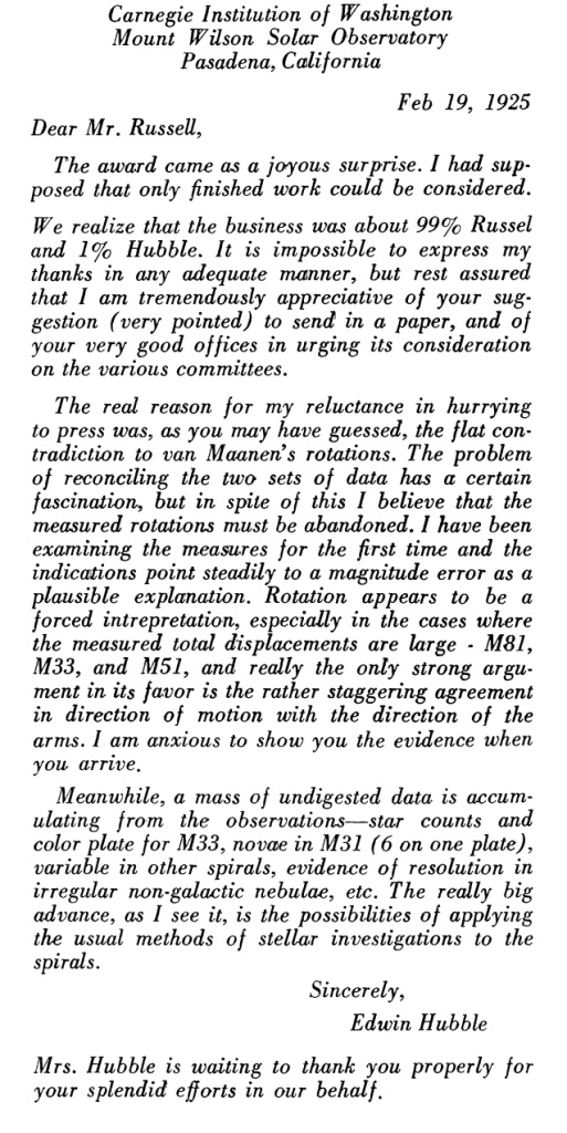 Recomiendo la lectura completa de este artículo en el que se reproduce el intercambio epistolar acerca de la concesión y aceptación del premio, así como la preocupación de Hubble por sus discrepancias con las medidas obtenidas por Adriaan van Maanen.