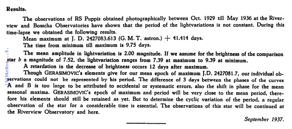 Voûte, R., “RS Puppis”, Annals of the Bosscha Observatory Lembang (Java) Indonesia, vol. 8, pp. 31–35, 1939.