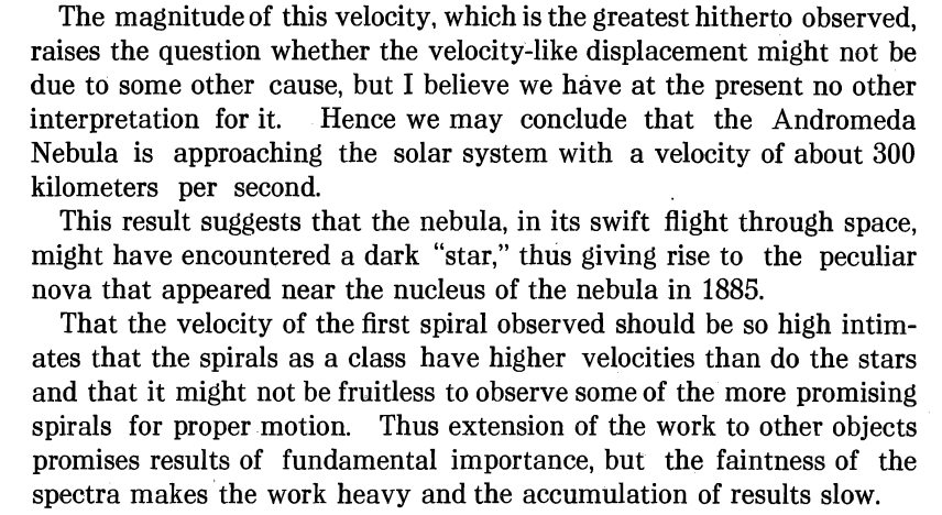 Puesta a perderme entre tanto artículo, resaltaré este fragmento del artículo de 1914 en que Vesto Slipher explicaba que ‘la espiral Andromeda’ se estaba aproximando a nuestro sistema solar a una velocidad de 300 km/s … una joya más (para mí) que se puede encontrar en su lectura, la explicación que encontraba para la aparición de una nova en su núcleo en 1885 … en ese momento él tenía 10 años, ¿pudo observarla?¿leyó sobre ella?