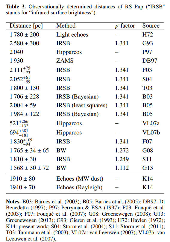 Para terminarlo de arreglar, el mismo artículo nos muestra una comparativa de todas las distancias calculadas para RS Puppis:
