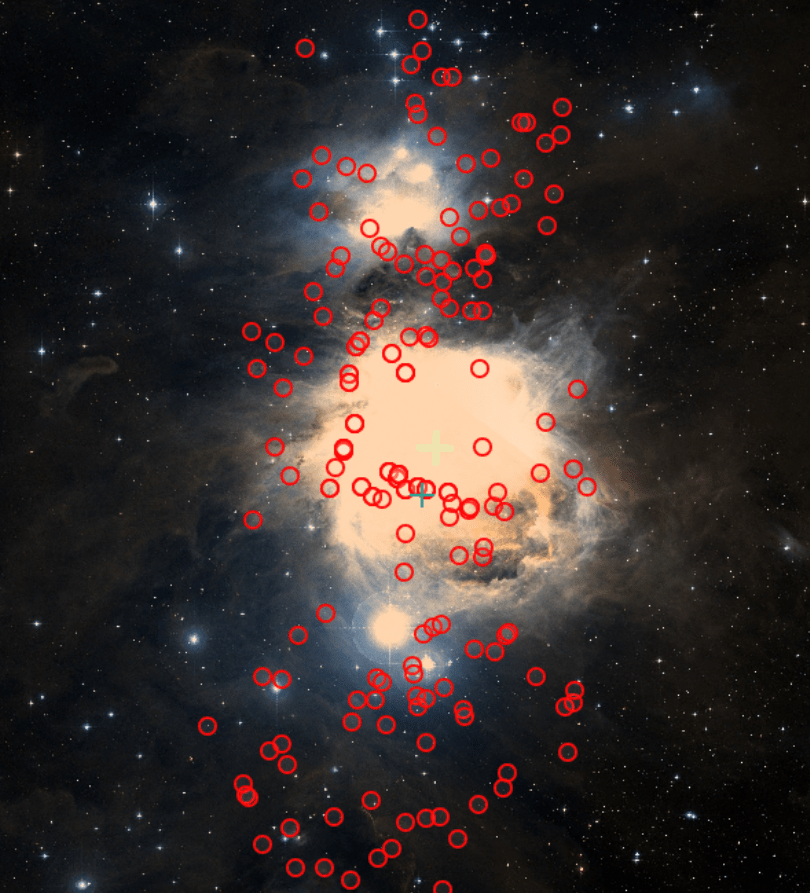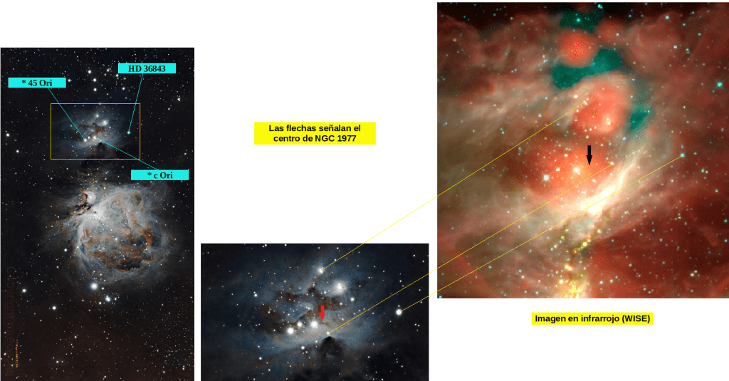 El punto rojo señala el centro de NGC 1977 y las estrellas registradas nos dan una imagen de la dispersión.