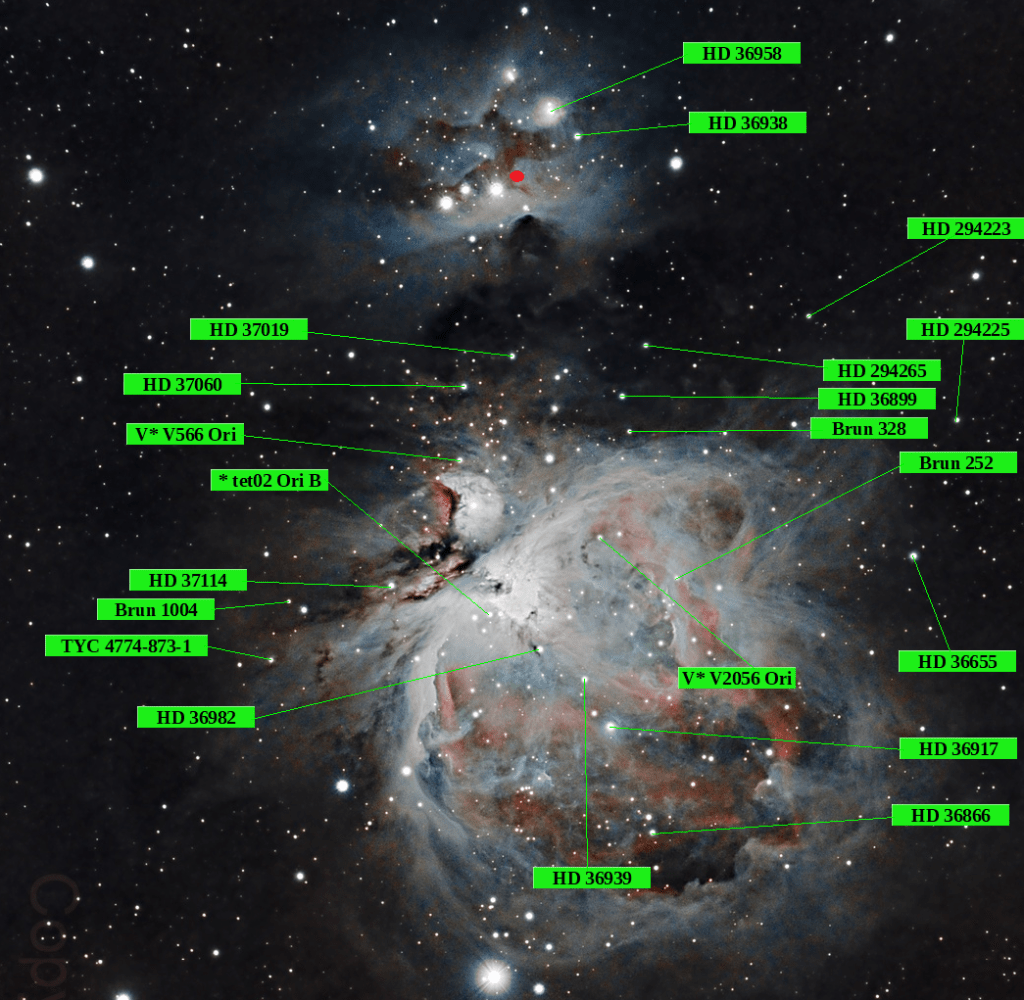 A su lado se pueden distinguir en la fotografía otras variables Orion que parecen un pobre testimonio si tenemos en cuenta las incontables que se encuentran repartidas en estos objetos. Se pueden ver en todo su territorio.